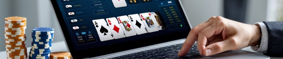 Seseorang sedang bermain blackjack online dengan komputer dan kartu serta chip poker di atas meja.