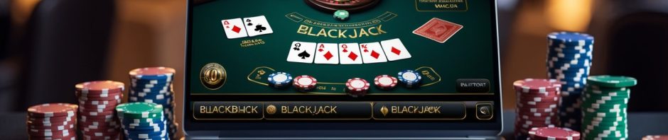 Seorang pemain duduk di depan laptop dengan tampilan permainan blackjack online, dikelilingi kartu remi, chip poker, dan buku catatan strategi.