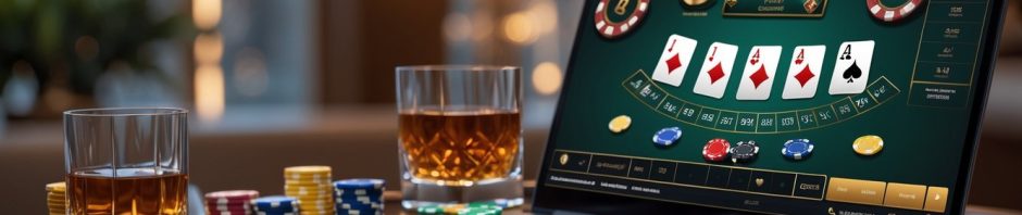 Sebuah laptop modern menampilkan permainan baccarat online dengan kartu dan chip di atas meja kayu yang rapi, dikelilingi chip baccarat dan gelas minuman.