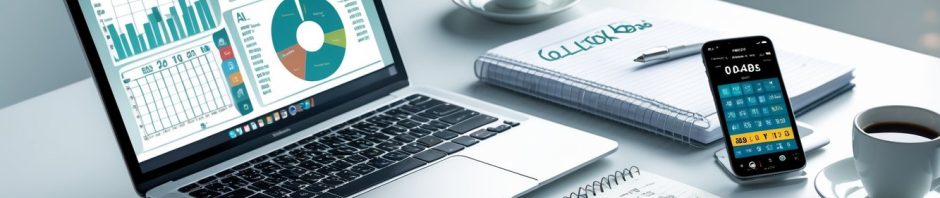 Meja kerja dengan laptop menampilkan grafik angka, tiket togel 4D 3D 2D, dan catatan strategi di lingkungan kantor yang rapi.